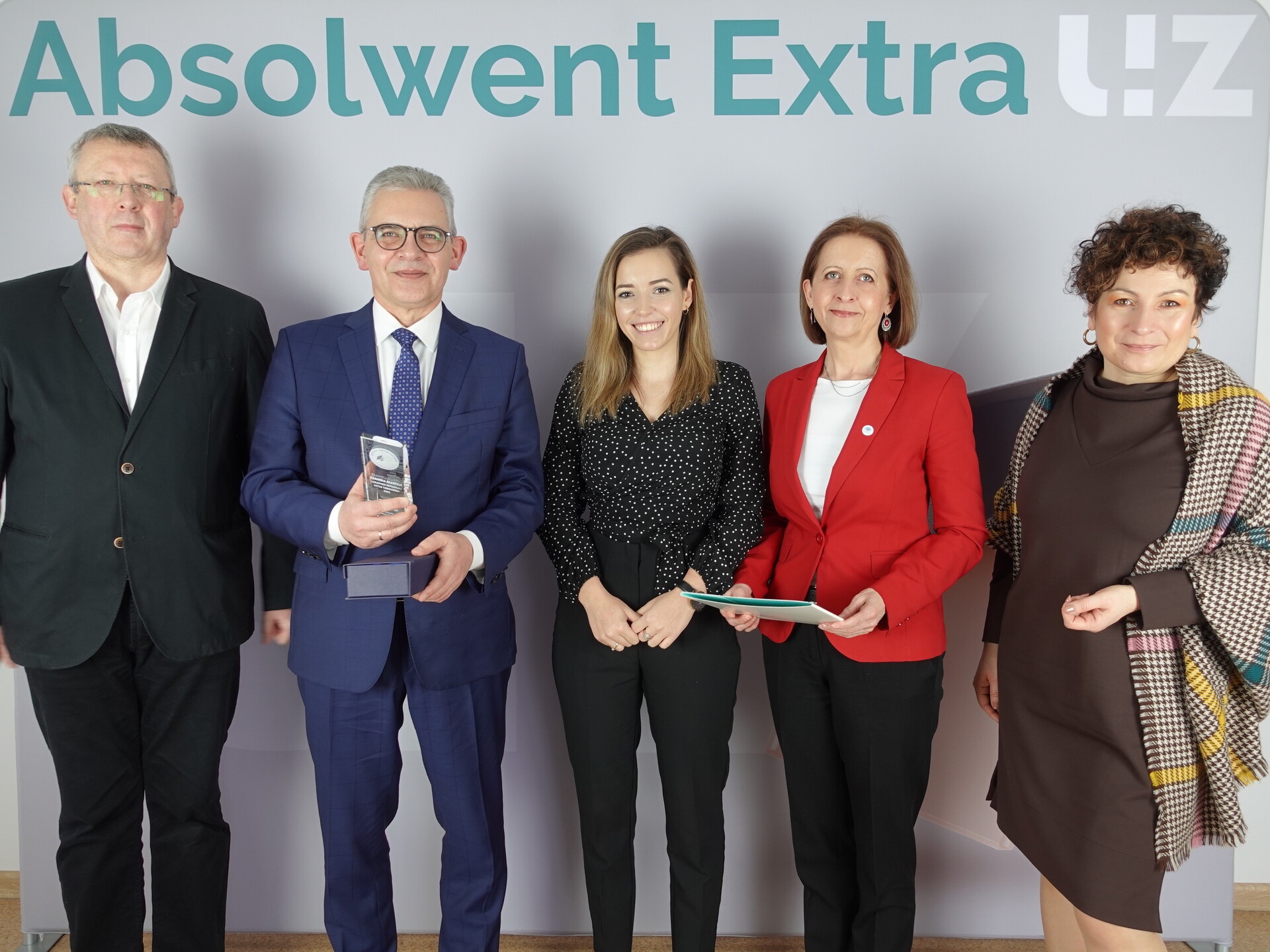 od lewej: mgr inż. Monika Politańska - Kierownik Biura Karier UZ, prof. dr hab. Wojciech Strzyżewski - Rektor UZ, mgr Alicja Frącek - Absolwentka Extra, dr hab. Bogdan Szal, prof. UZ - Dziekan WMIiE, dr hab. Barbara Literska, prof. UZ - Prorektor ds. Studenckich UZ; fot. M. Leśniak