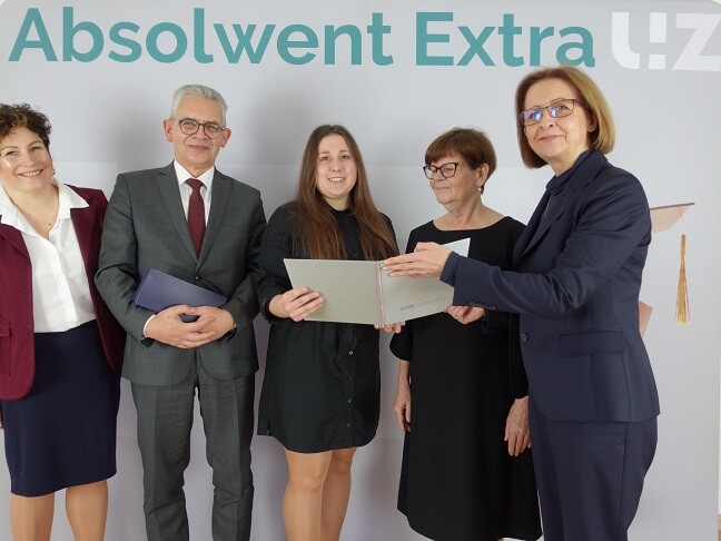 Od lewej: kierownik Biura Karier UZ - mgr inż. Monika Politańska, Rektor Uniwersytetu Zielonogórskiego - prof. dr. hab. Wojciech Strzyżewski, lic. Joanna Nawlicka, Dziekan Wydziału Humanistycznego - dr hab. Małgorzata Łuczyk, prof. UZ oraz Prorektor ds. studenckich - dr hab. Barbara Literska, prof. UZ; fot. M. Leśniak
