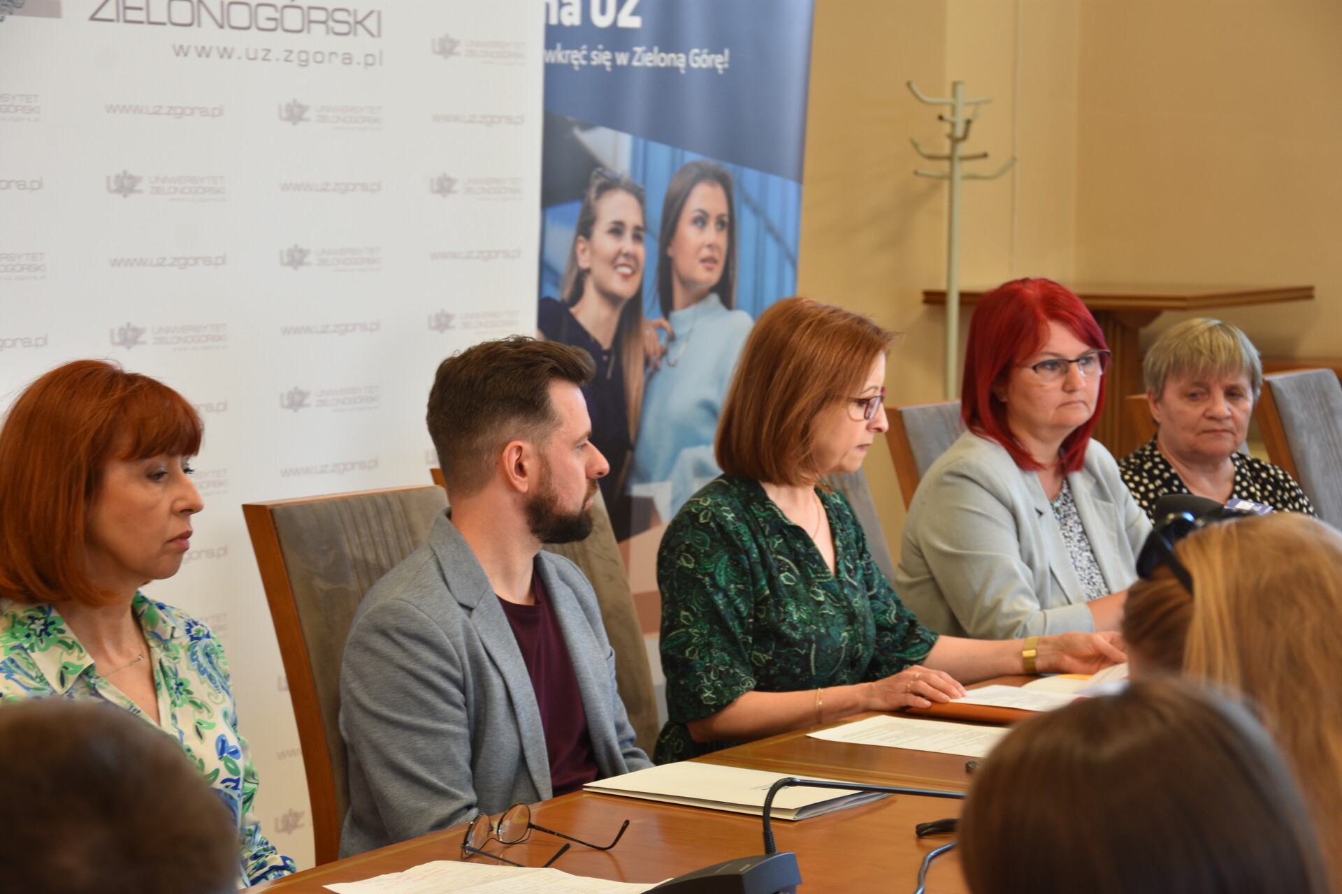 Konferencja prasowa - Rekrutacja 2023/24: dr Ewa Skorupka, dr Arkadiusz Tyda, dr hab. Barbara Literska, prof. UZ, dr hab. inż. Sylwia Myszograj, prof. UZ, mgr Grażyna Milewska-Wilk, fot. Biuro Promocji UZ