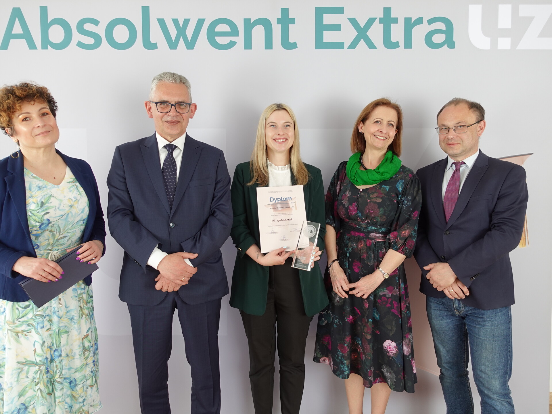 od lewej: Monika Politańska - kierownik Biura Karier UZ, prof. Wojciech Strzyżewski - rektor UZ, Barbara Markulak - Absolwentka Extra, prof. Barbara Literska - prorektor ds. studenckich UZ, prof. dr hab. inż. Andrzej Obuchowicz - dziekan Wydziału Informatyki, Elektrotechniki i Automatyki; fot. M. Leśniak
