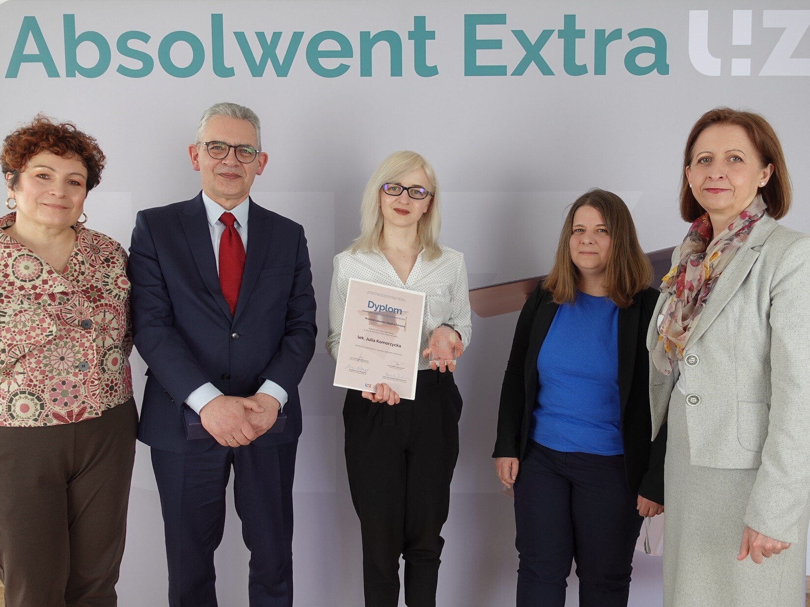 od lewej: Monika Politańska - kierownik Biura Karier UZ, prof. Wojciech Strzyżewski - rektor UZ, Julia Komorzycka - Absolwentka Extra, dr hab. n. med. Agnieszka Ziółkowska - Dziekan Wydziału Lekarskiego i Nauk o Zdrowiu, prof. Barbara Literska - prorektor ds. studenckich UZ; fot. M. Leśniak