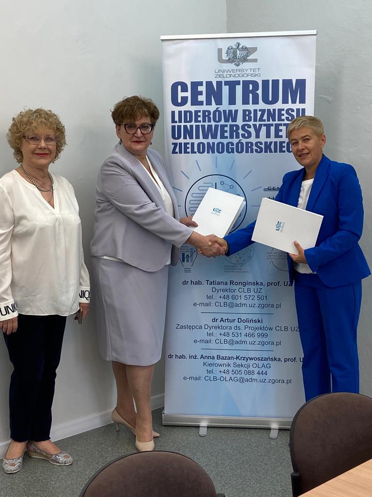 dr hab. Tatiana Ronginska, prof. UZ - Dyrektor Centrum Liderów Biznesu UZ, mgr Małgorzata Ragiel - Dyrektor Centrum Kształcenia Zawodowego i Ustawicznego nr 1 „Budowlanka” w Zielonej Górze i dr hab. inż. Maria Mrówczyńska, prof. UZ - Prorektor ds. Współpracy z Gospodarką