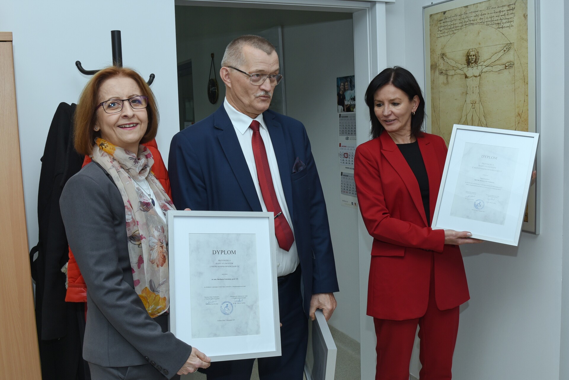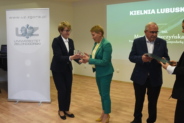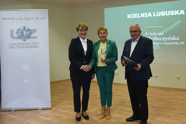 Dr hab. inż. Maria Mrówczyńska, prof. UZ - Prorektor ds. Współpracy z Gospodarką UZ oraz dr Sławomir Kotylak - Dyrektor Departamentu Infrastruktury i Komunikacji Urzędu Marszałkowskiego Województwa Lubuskiego wręczają nagrodę, fot. K. Adamczewski