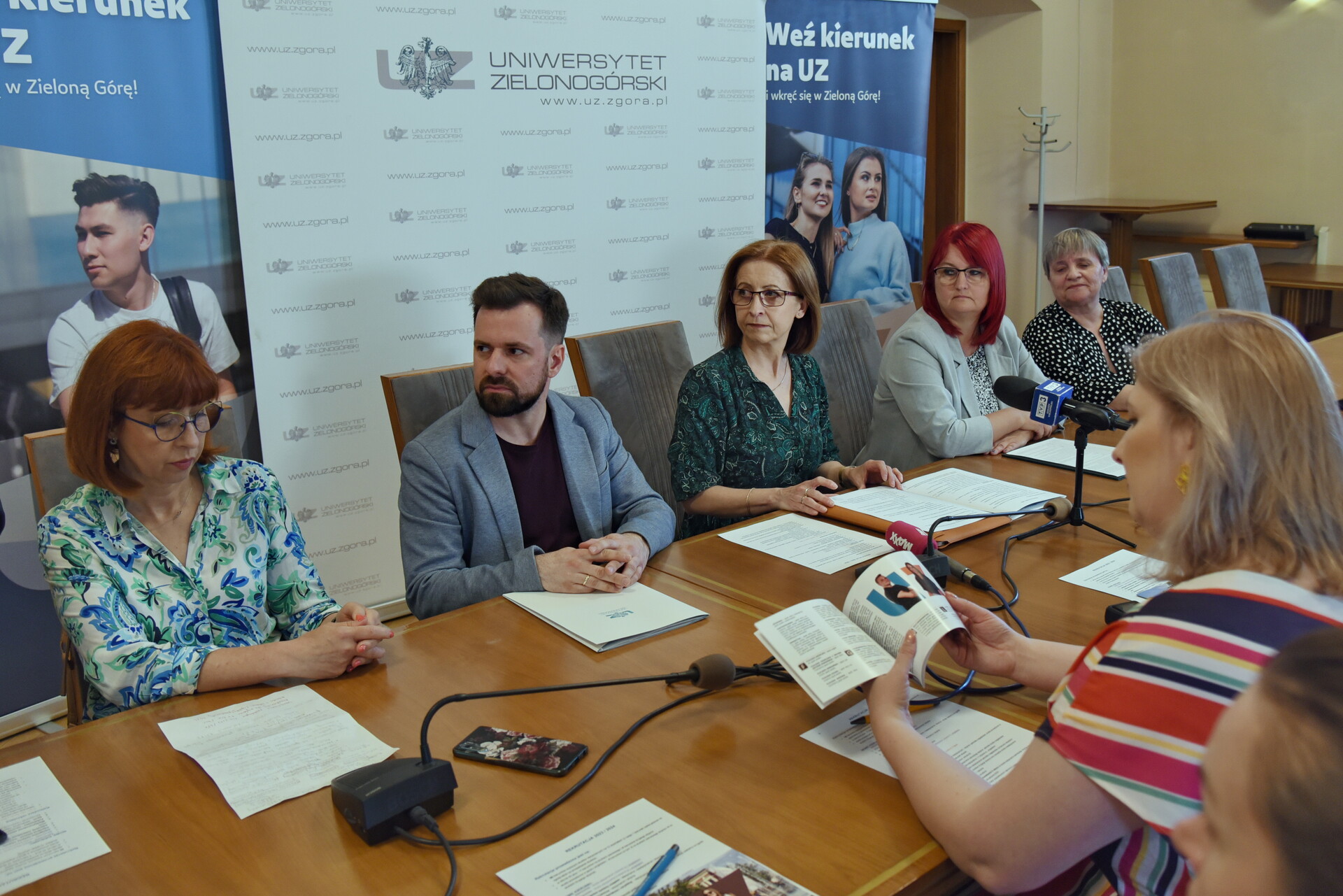Konferencja prasowa - Rekrutacja 2023/24: dr Ewa Skorupka, dr Arkadiusz Tyda, dr hab. Barbara Literska, prof. UZ, dr hab. inż. Sylwia Myszograj, prof. UZ, mgr Grażyna Milewska-Wilk, fot. K. Adamczewski